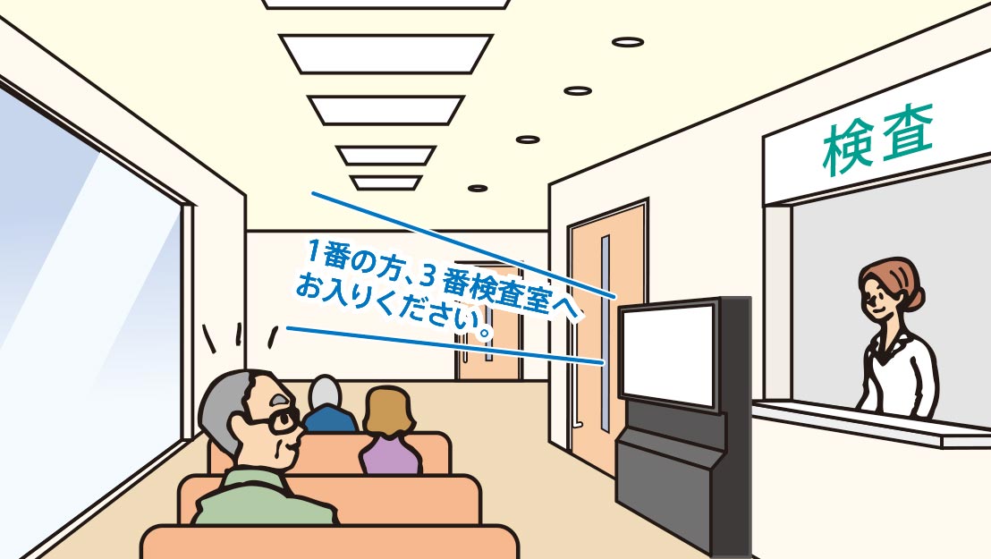 患者さまの番号を音声で呼び出します。目の不自由な方にもやさしく、柱などでモニタが見えにくい場所におられる患者さまなどにも、しっかりと誘導することができます。